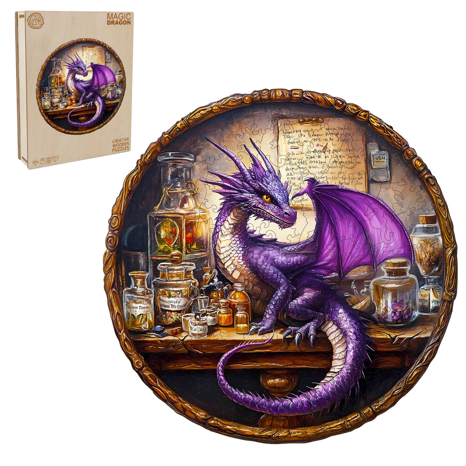 Step into the magical world with our Purple Dragon Puzzle. This beautifully crafted puzzle features a majestic purple dragon perched among potion bottles and ancient scrolls, creating a mystical and enchanting atmosphere. The intricate details and vibrant colors make it a perfect choice for puzzle enthusiasts and fantasy art collectors.